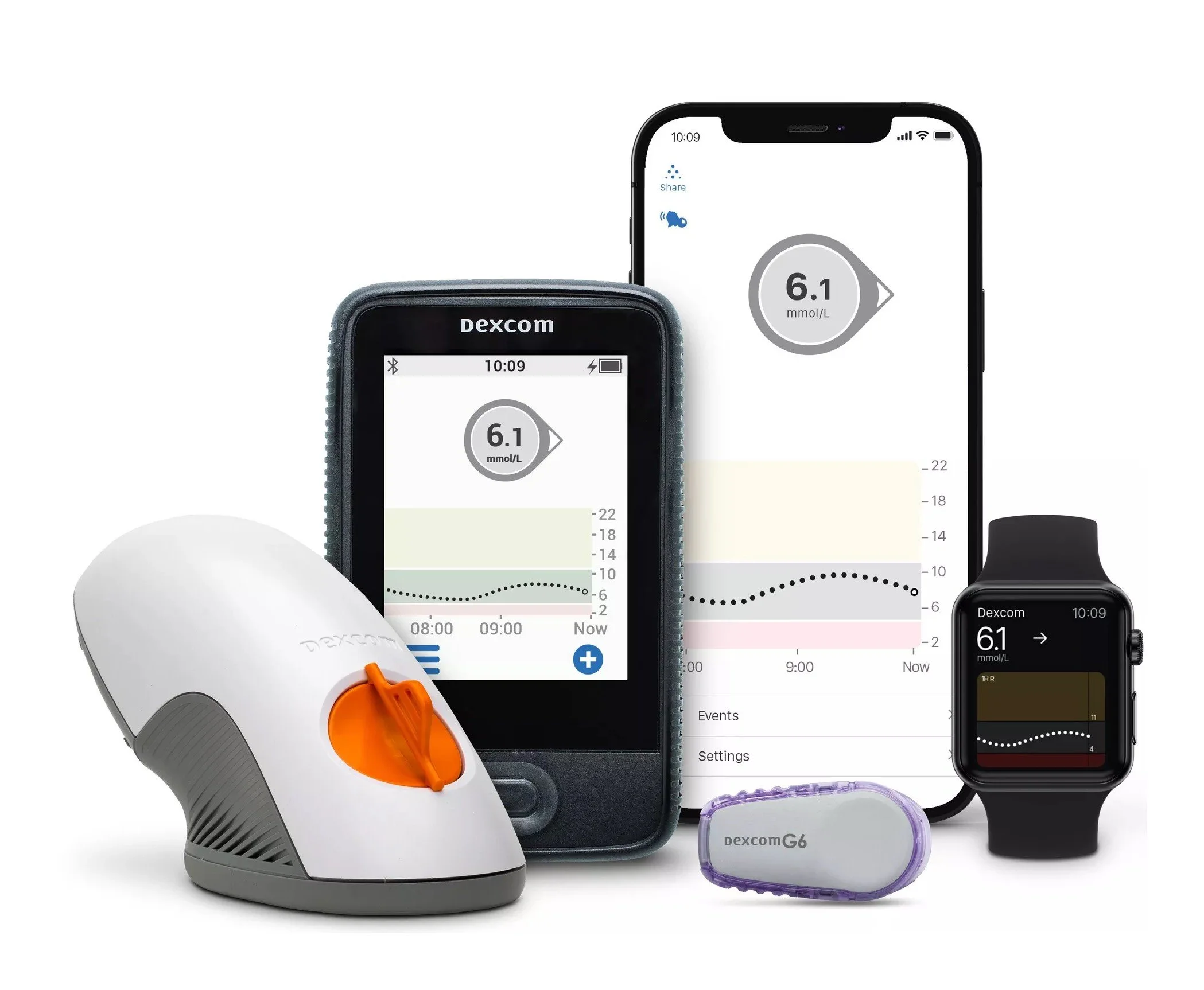 The Dexcom G6 system includes the applicator, receiver, sensor, transmitter, phone, and watch apps.
