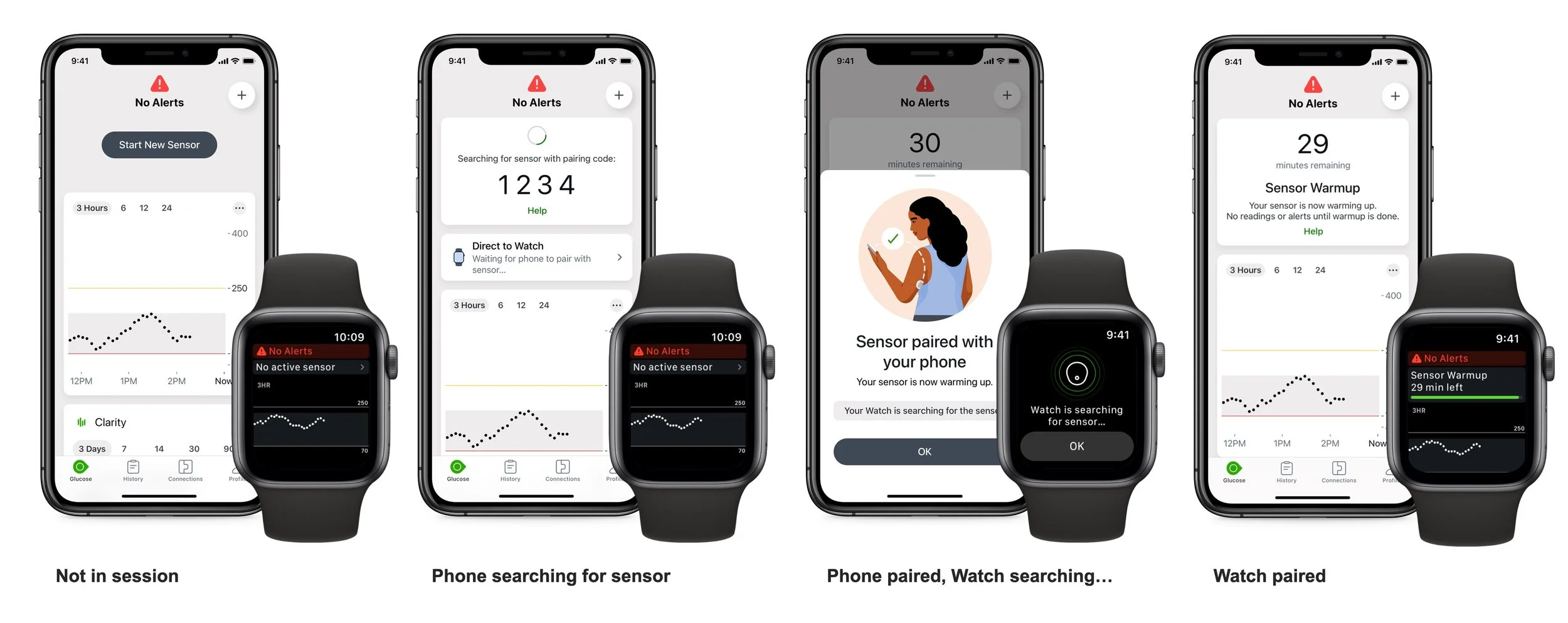 Our DTW onboarding explains to users that they must first pair their sensor with their phone, then the app will pair with the Watch (Apple requires a prompt on each device for the user to allow the pairing). We also explain to users that if the Watch temporarily loses data directly from the sensor, it can still get readings from the phone. In this situation, the Watch displays a phone icon to make users aware that they need to keep that device nearby until a direct connection with the sensor is restored. Having two connections with the sensor allows for each device to backfill from the other when needed.