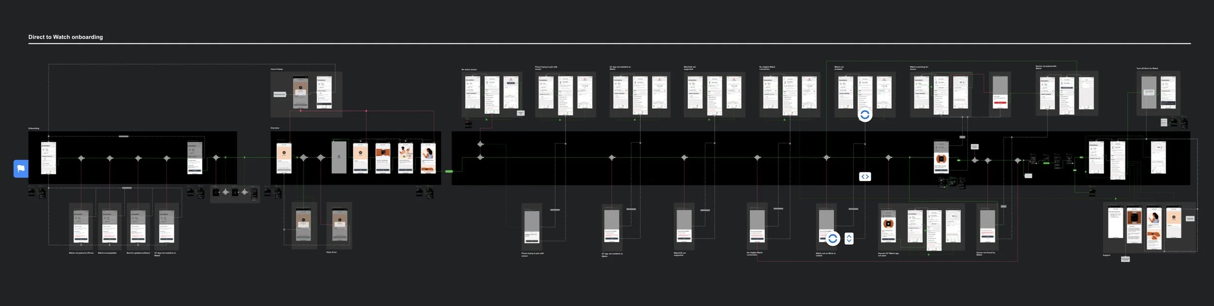 When a user meets the requirements, they can start the feature onboarding. It begins with a video that explains the difference between the standard experience (where a user needs their phone to get watch app data) and DW. After a risk mitigation screen and explanation about Share support, we explain to users the sensor pairing process.