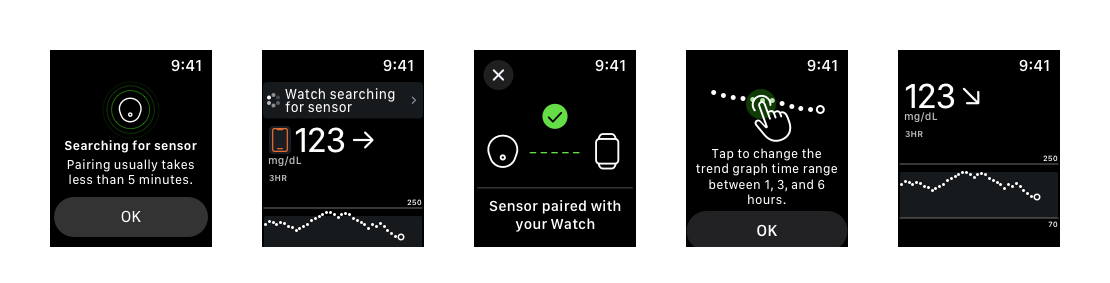 Once the pairing process is initiated, the user can see messaging on their Watch (screen 1) . If they tap OK, they are shown both a searching for sensor banner and also an orange phone icon to the left of their current glucose reading (screen 2).