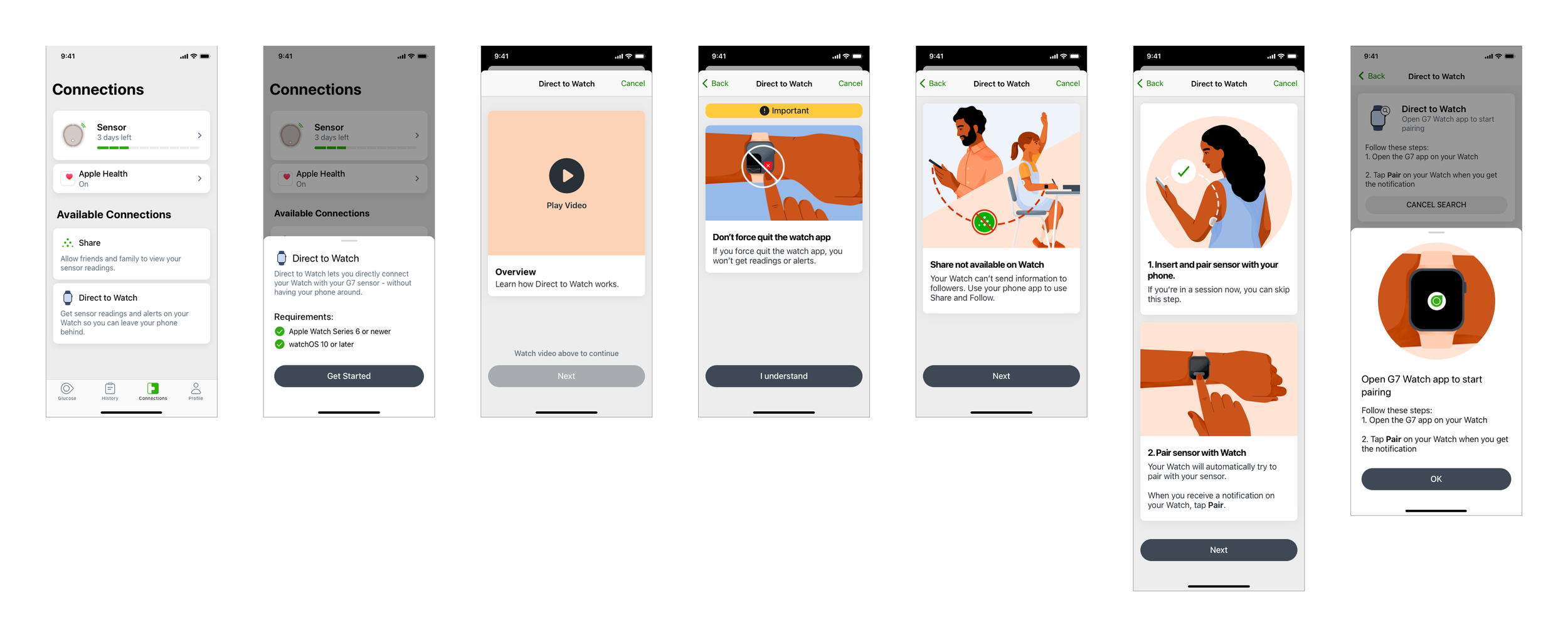 To start activation of DTW, a user goes to the Connections tab in the G7 iOS app and taps on the Direct to Watch card. Dexcom worked with Apple to update how iOS Critical Alerts work. As a result, we need a minimal version of iOS and watchOS (which maps to certain Watches that support that version). The user must install and foreground the G7 Watch app for us to runtime there to do the requirements check.